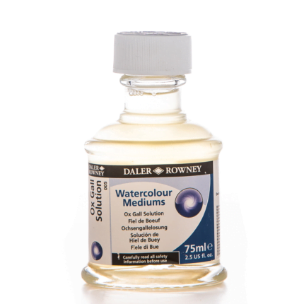 Daler Rowney Ox Gall Solution is an artist's medium designed to improve the appearance of your paintings and give you more creative options when working with watercolour paint. The liquid improves the wetting and flow of your watercolour. Just add a few drops to the mixing water and it can also improve the acceptance of watercolour on paper, and particularly hard-sized papers. Very little is needed for the solution to work effectively. There is 75ml in each bottle.