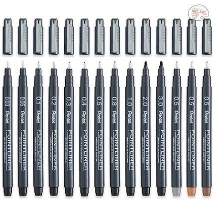 Pentel S20P Pointliner Pigment Liner Technical Drawing Fineliner Pen- Black, Sepia, Sanguine & Grey Ink – Pack of 14