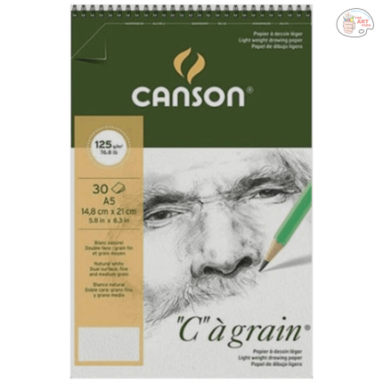 - Canson “C” a Grain pad is glued on the short side, A5 size and includes 30 sheets of lightweight 125gsm drawing paper.