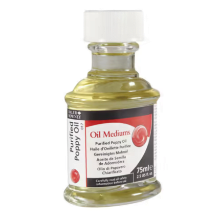 Daler Rowney's Poppy Oil is clear in colour and is commonly used to mix with light colours; other oils, such as Linseed will cause lighter colours to yellow. Poppy Oil is less inclined to yellow than Linseed Oil, but is slower drying. When mixed with colour, this oil will enhance gloss and flow, but using it in high proportions will prevent the colour film from drying thoroughly.