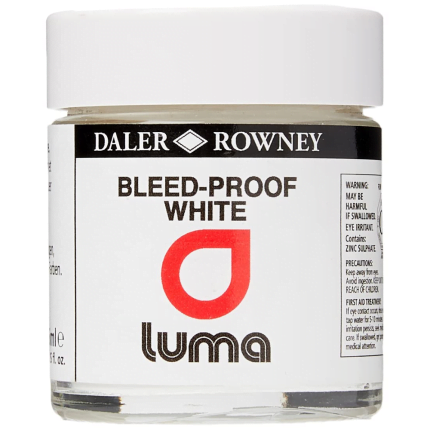 Daler-Rowney Luma Bleed-Proof ink is a very opaque watercolour that stays brilliantly white when used to cover dyes, designer's colours, markers and more.