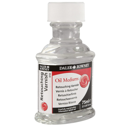 Daler-Rowney Retouching Varnish is a versatile varnish that is used to bring back the original paint quality of dry or dull oil paints. Daler-Rowney Retouching Varnish can be reduced with solvents, and it is much thinner than final top coat varnishes. It can be used as a preliminary varnish as soon as the paint surface is dry to the touch, since oil paints can continue to dry out through the film. This can be useful for varnishing a new painting before an exhibition. After a painting is fully dry, a retouching varnish can be removed with turpentine or mineral spirits prior to final varnishing, or it can be left underneath the final varnish.